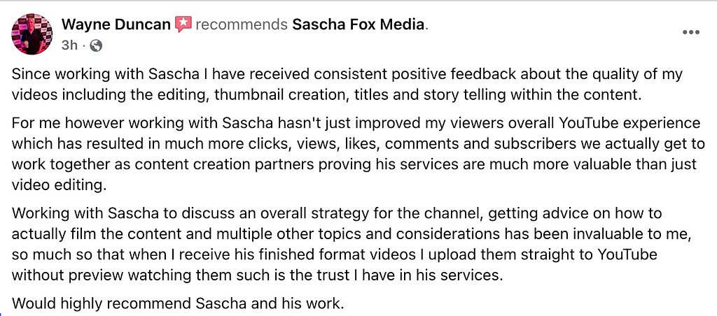 “When I receive Sascha’s finished videos, I upload them straight to YouTube without previewing them — such is the trust I have in his work.”