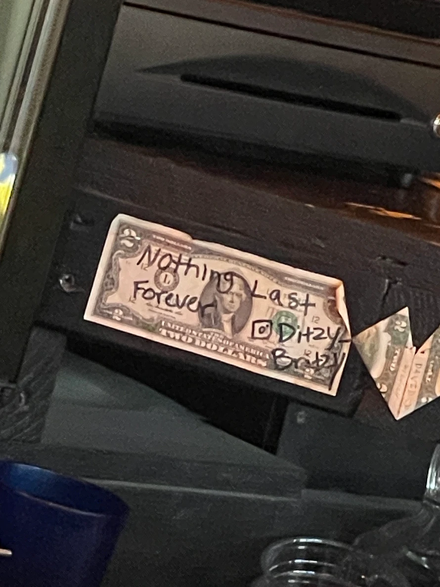 At the bar, right in front of me, a dollar bill was pinned to the wood. In black marker, it read: